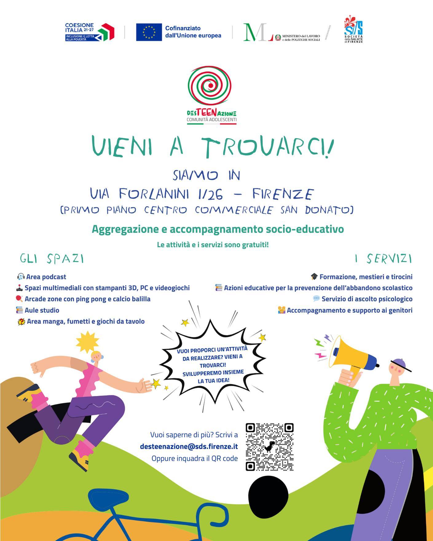 Il progetto DesTEENazione mira a creare uno Spazio Multifunzionale di esperienza, un luogo pensato per valorizzare le risorse individuali e favorire l’espressione delle potenzialità di preadolescenti e adolescenti. Le attività proposte all’interno di questo spazio hanno l’obiettivo di stimolare la partecipazione attiva di ragazze e ragazzi, promuoverne l’integrazione e l’inclusione sociale, sviluppare le loro competenze affettive e relazionali e prevenire la dispersione scolastica.